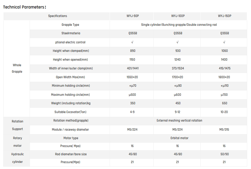 Using special steel, it has advantages such as light weight, good strength, and wear resistance; The WYJ-90P excavator grab is suitable for high-strength wood grabbers used in 6-9 ton excavators; The grab control method adopts an electronic control handle operating system, equipped with imported solenoid valves, which can control the speed; Can rotate clockwise and counterclockwise 360 degrees for smooth operation; Suitable for construction scenarios such as eucalyptus loading and unloading, bamboo loading and unloading, sugarcane loading and unloading, improving work efficiency and saving labor costs.